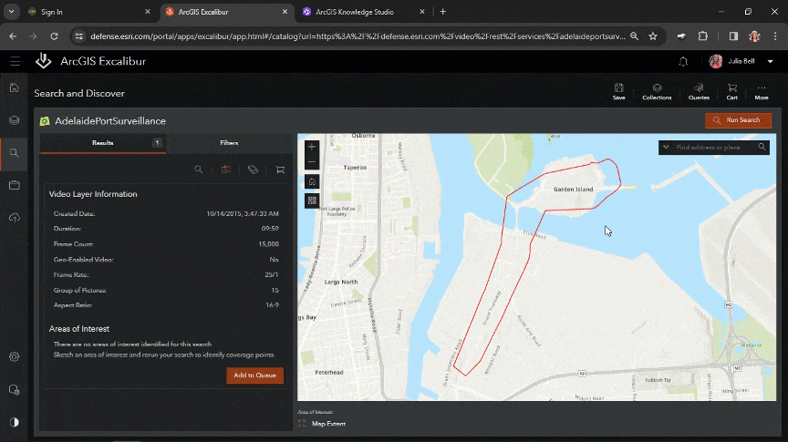 Analysts can identify video footprints over the port of interest in Adelaide through ArcGIS Excalibur. Zooming into the specific location of interest, the building where most of these meetings occurred can be easily identified. A point-based or polygon-based search filter can be applied to the video based on this specific location of interest to find all the times in the video that this building is visible, which saves time and enhances the collections process.