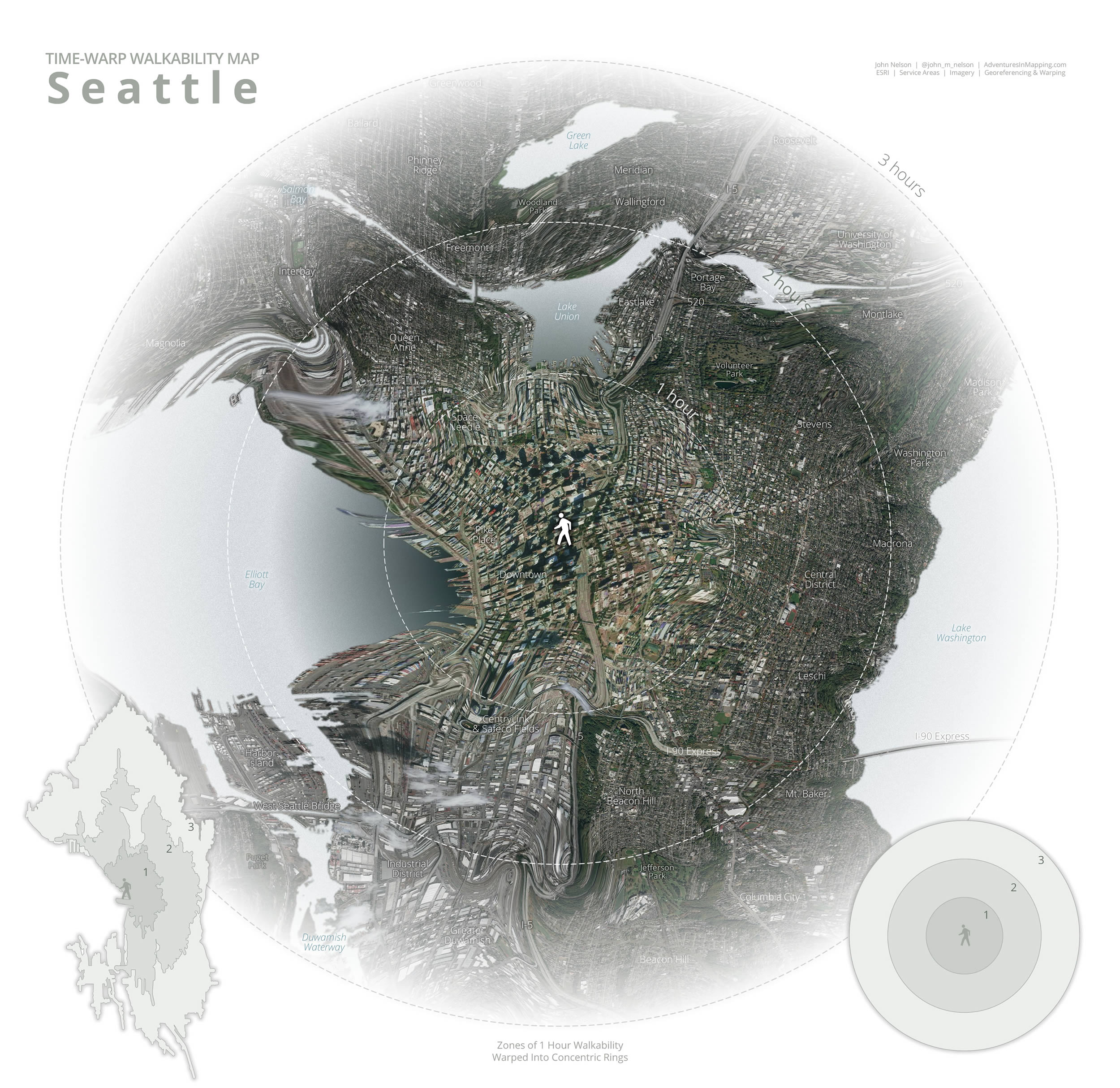 Here is a ridiculous walking distance map of Seattle. The geography of areas accessible via a 1, 2, and 3 hour stroll are warped into concentric rings. While it looks like an ice cream cone on a hot day, its actually a pretty practical map -if you’re a pedestrian.