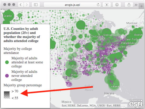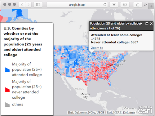 For example, in the image below the map contains a single feature layer of U.S. counties with two competing numeric fields; one contains the number of adults who attended college, and the other the number of adults who did not. They are competing because all adults fall into one of these categories – not both and not none. Blue features indicate counties where more adults attended college than those who didn’t. Red features depict the inverse – more adults did not attend college than those who did. Opacity is optionally used to show the strength of the predominant variable. If a county is shaded with a very opaque color then the “winning” category won by a large margin, whereas transparent features indicate the competing variables are nearly equal to each other.