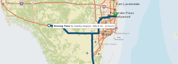 The user experience of the Directions widget has been revamped to allow users to alter routes by adding and dragging waypoints and route segments. When the user drags a waypoint or a route segment, tooltips appear revealing predicted travel time and distance alterations to the route prior to the user finalizing the placement of the moved waypoint or segment.