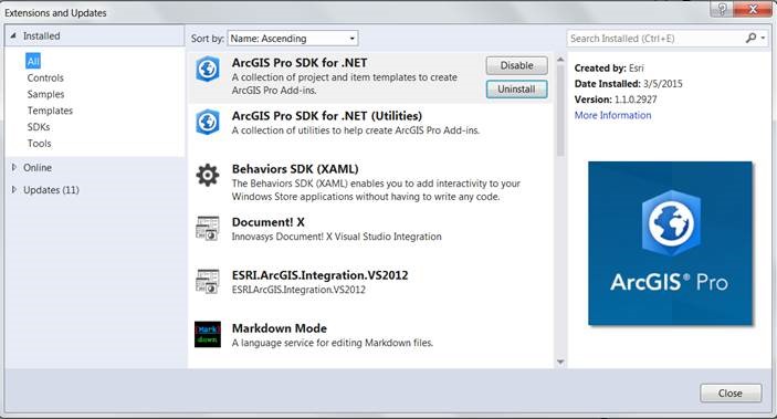 At 1.1 (Final) the ArcGIS Pro SDK for .Net can be installed directly from within Visual Studio using its Extension and Update mechanism. Simply install the ArcGIS Pro SDK by clicking on the gallery entry in the Extensions and Updates dialog. Updates to the ArcGIS Pro SDK will be shown to the developer as Visual Studio notification popups.