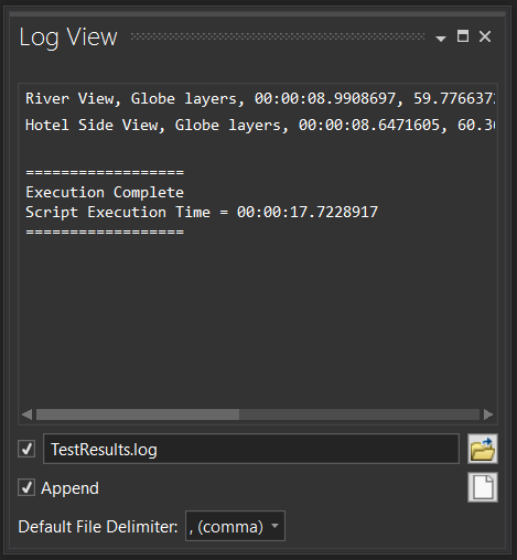 - The results above show us that ArcGIS Pro took 8.99 seconds to navigate to and render the “River View” bookmark, and 8.64 seconds for the “Hotel Side View” bookmark. The total elapsed time for the script execution was 17.72 seconds. You’ll also notice options to store these results in a log file, and whether each run should overwrite previous results, or append them (when checked). You can, of course, maintain and archive these log files for future reference.
