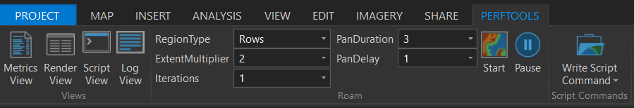- Next time you launch Pro and open a project, you’ll notice a new menu on the ribbon titled “PERFTOOLS”. This contains icons for accessing the various script, log, and metrics views, generating roam commands, and writing script commands.