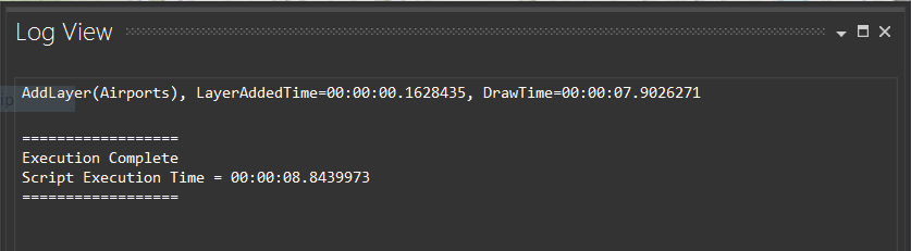 If you examine the Log View, you will see results for the AddLayer command. Specifically, “LayerAddedTime” and “DrawTime”. The first measures the time to connect to and read in the data source, and the second describes the time it takes to render the data in the map display.
