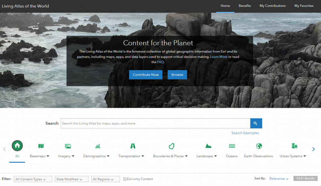 We made several enhancements to the Living Atlas of the World website (livingatlas.arcgis.com) that make it easier to browse, filter, and contribute to the Living Atlas. We continuously strive to provide the best experience for our users, and we hope these changes help us meet this goal. This release includes two new languages, Spanish and Brazilian Portuguese. Updates have also been made to the Home tab (or landing page) and the My Contributions tab. We rearranged the Home tab to make discovering Living Atlas content more straightforward, and we made subtle improvements to the My Contributions tab to make contributing easier.
