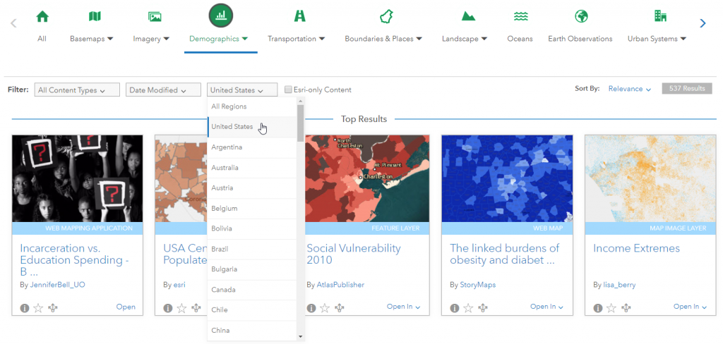 - Filter menus have been moved below the Living Atlas themes and now include a region filter. (This filter was formerly part of the theme list in green above the filters.)