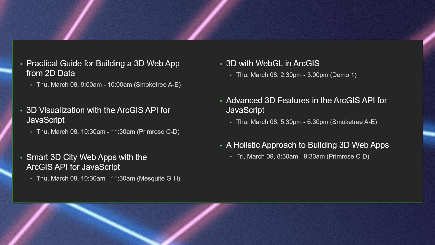 This example pathway is about learning the fundamentals of 3D web development, and helping you to build a responsive web app, with a brief overview of the API widgets. Two 3D sessions worth highlighting in this section are 1): 3D Visualization, this will be an inspiring session all about the various techniques available for styling your 3D scene (both from a data authoring perspective, and from within the JavaScript API), and, 2): Creating a Smart 3D City Web App, which will demonstrate how you can use Scene Layers to create compelling user experiences with your 3D features and attributes.