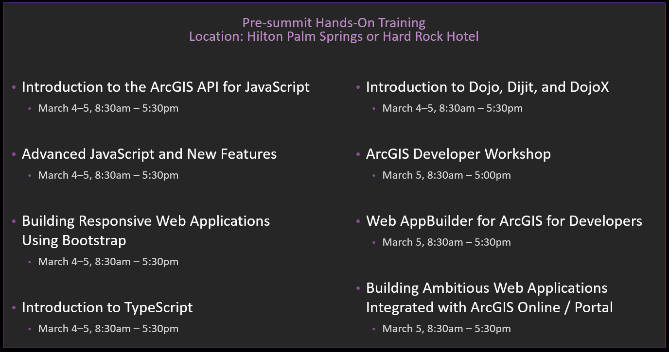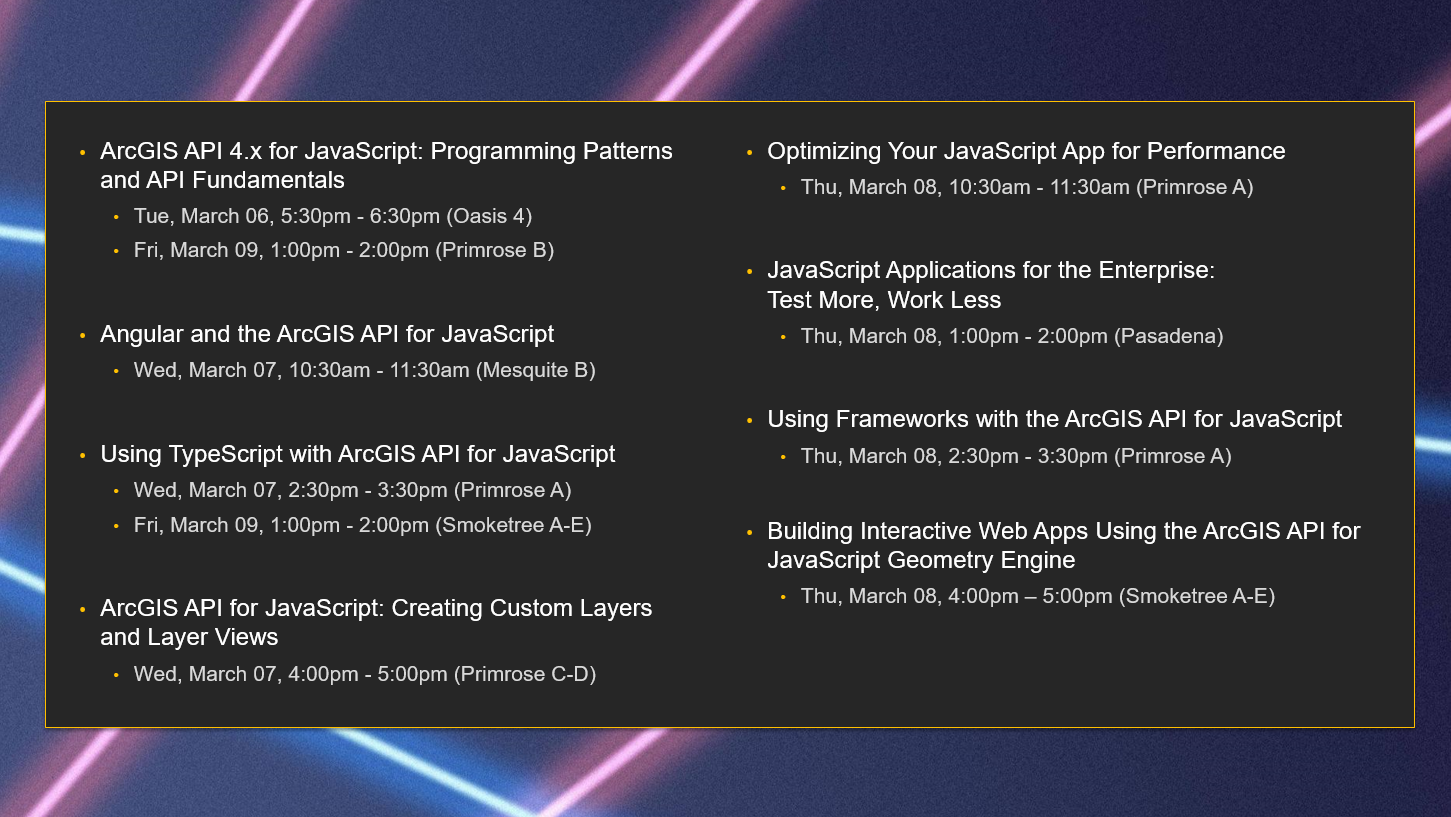 The 2018 Esri Developer Summit in Palm Springs, CA is right around the corner. It will feature a lineup of more than 50 technical sessions and demo theaters focused on web development and ArcGIS API for JavaScript topics. With so many interesting sessions to choose from, we thought it would be useful to make a handy guide tailored for our web development community. This blog will describe the main topics of sessions to attend, or, you can access them as a single pdf file here: Web Development Sessions. For a complete list of sessions, search for “JavaScript” in the Developer Summit Agenda page.