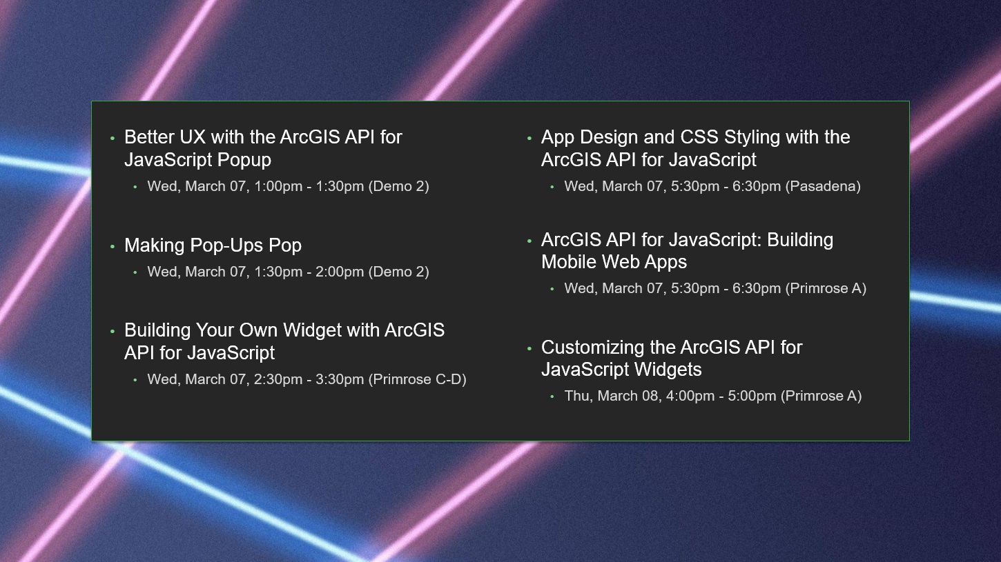 We want to help you make the most of your week. One of the best ways to get a taste for all the sessions throughout the Conference is to attend the very first session after the Plenary, Inside Scoop: Navigating Your Way Through the ArcGIS API for JavaScript Sessions. In this session, the presenters will each get five minutes to promote their session. The goal is to give you a quick preview of each of the sessions, and answer any questions you have about what will be covered.