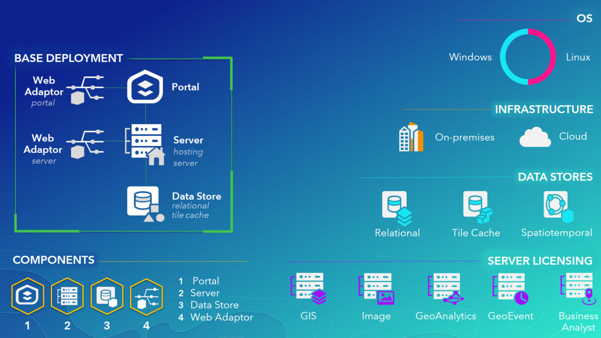 ArcGIS Enterprise includes all the functionality you’ve received from the traditional ArcGIS for Server, including data management, mapping and visualization, and powerful analytics. In addition, it also provides the infrastructure needed to power a modern suite of GIS and location-based apps across desktops, browsers, and mobile devices. This infrastructure includes a portal and managed data store to provide a safe location for the data you generate or hand over to the system in addition to the data you continue to manage externally in your enterprise geodatabases.