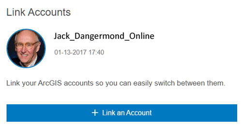 If you use multiple accounts for ArcGIS Online, you can now link accounts so you can switch easily between them. You can also connect your Esri websites, such as customer information for My Esri, e-Learning, GeoNet, and more.