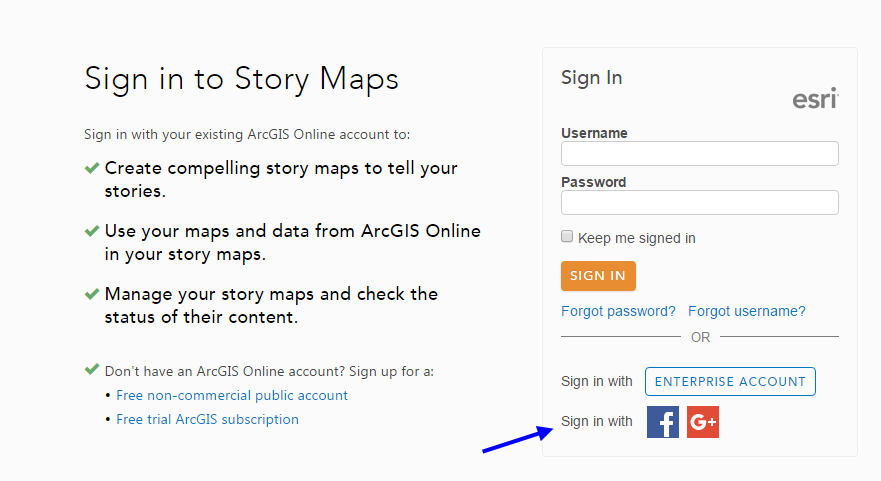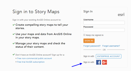 It’s easier for people to get started making story maps! Anyone can now simply sign into the Story Maps website or ArcGIS.com with their Facebook or Google credentials to get a free, non-commercial ArcGIS Public account.