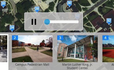 Autoplay mode is useful if you want to show a story map on a display monitor in a visitor center, tourist information kiosk, museum exhibit, trade show, your GIS department’s reception area, operations center, etc. In autoplay mode the story advances automatically creating a visually interesting and changing display. In this mode, a control appears on-screen that allows the playback speed to be adjusted or paused.