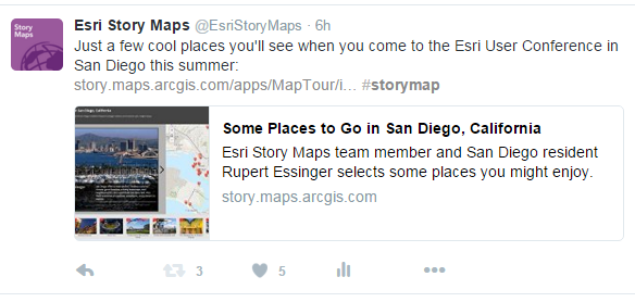 Also bear in mind that for your own story map social media posts, such as posts in your own or your organization’s Twitter feed, you can compose the post manually instead of relying on the default look you get using the Twitter and Facebook buttons in the app. For example if you look at the Esri Story Maps Twitter feed, you’ll notice that in tweets to story maps by @EsriStoryMaps and @Esri we normally use fullsize graphics to fill the space and attract attention.