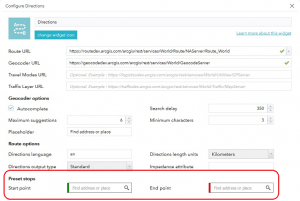 - Directions widget now supports predefined start and end stops, and displays the default travel modes at runtime when the travel mode URL is not specifically configured.