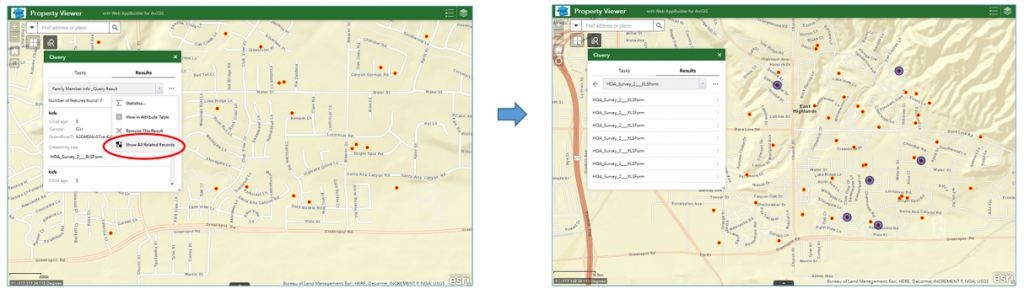 - Query widget: when running a query against a related table, all the related features can be highlighted on the map and listed in the panel; you can also change the symbol at runtime to highlight the query result differently on the map.