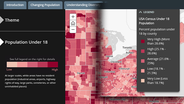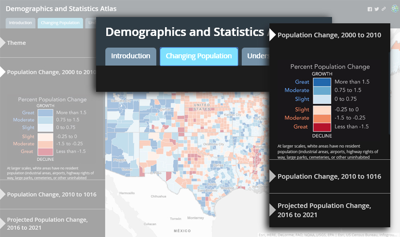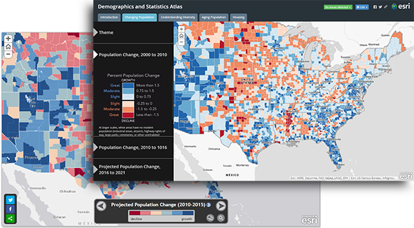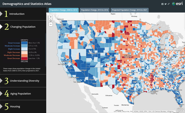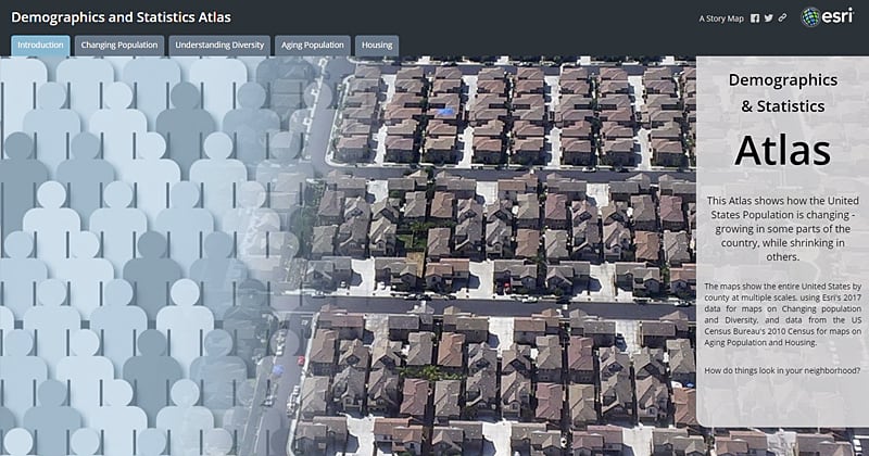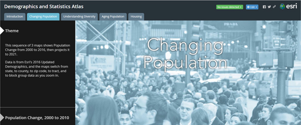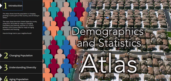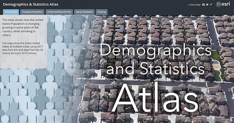 The Demographics and Statistics Atlas was one of the original samples we prepared to demonstrate the Atlas App. Here, I’ve rebuilt it using a combination of two Story Map Series apps.