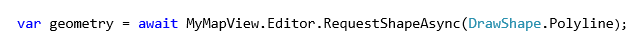 In order to measure distance and area on the map, you can work with the Editor to sketch geometries as graphics on the topmost layer of the map. The MapView control maintains a Graphics overlay collection which can be used to create and display these geometries on a temporary basis. The MapView control also provides convenient access to an Editor instance that will support geometry creation via the RequestShapeAsync method. Calling RequestShapeAsync will return geometry based on a specified DrawShape parameter.