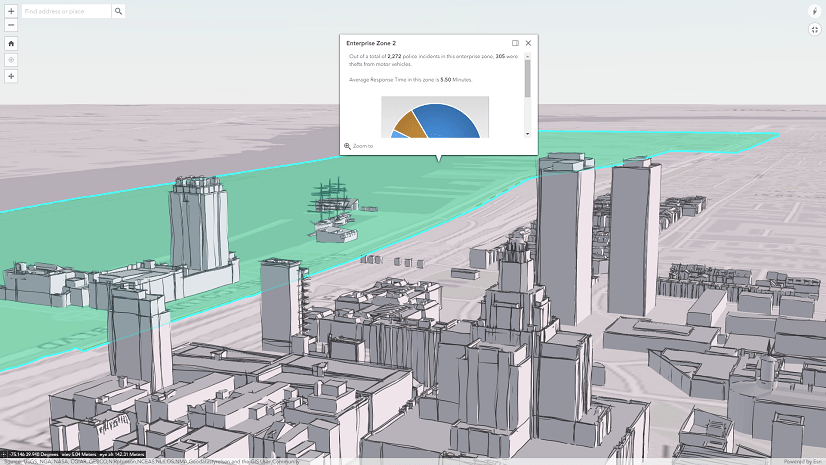 Things get really interesting when the user expands the inset map, and you’re navigating through data with a linked 2D and 3D view. This has been a capability that ArcGIS Pro users have been accustomed to, and now this app template provides a way distribute a similar experience on the web. Clicking on the 2D map repositions the scene view while activating pop-ups, and the user is provided with a scene view that contextualizes the operational view.