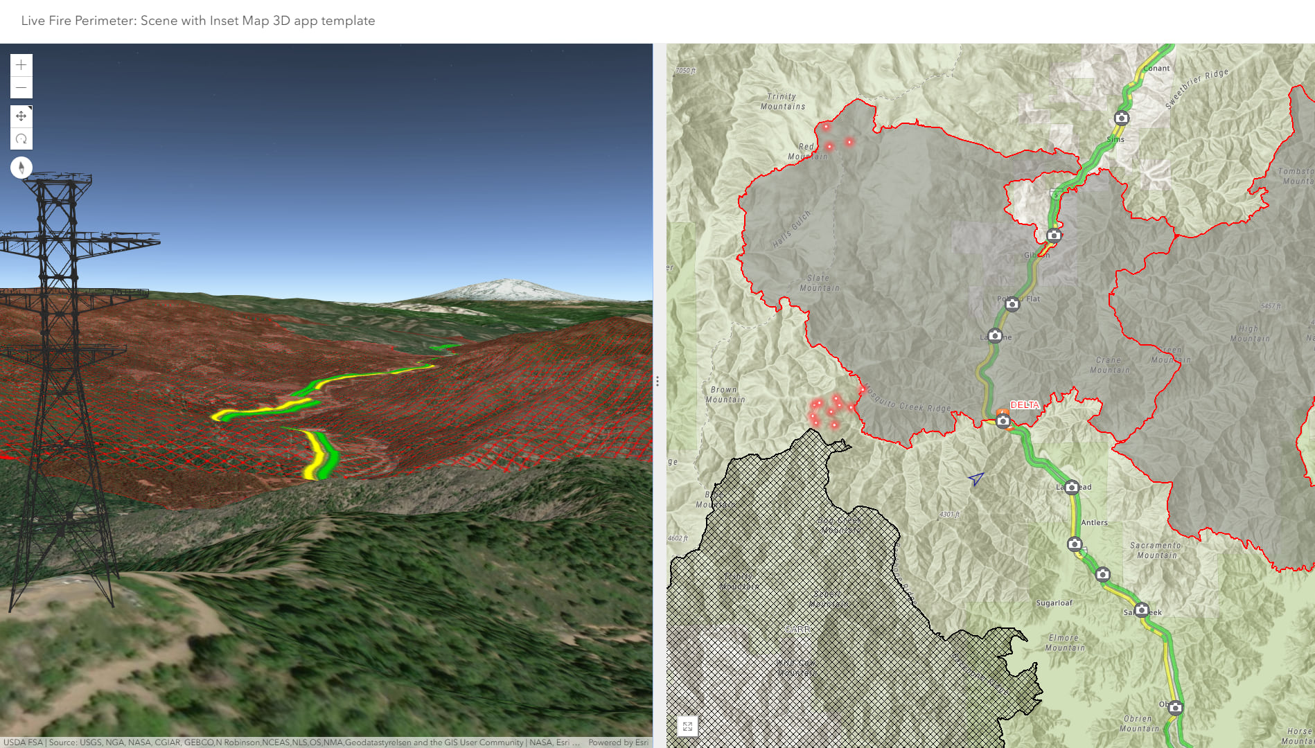 Scene Inset App Template is showing a live fire perimeter relative to a tower location in 3D