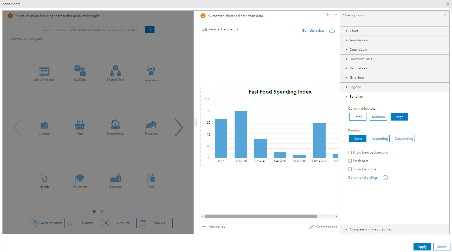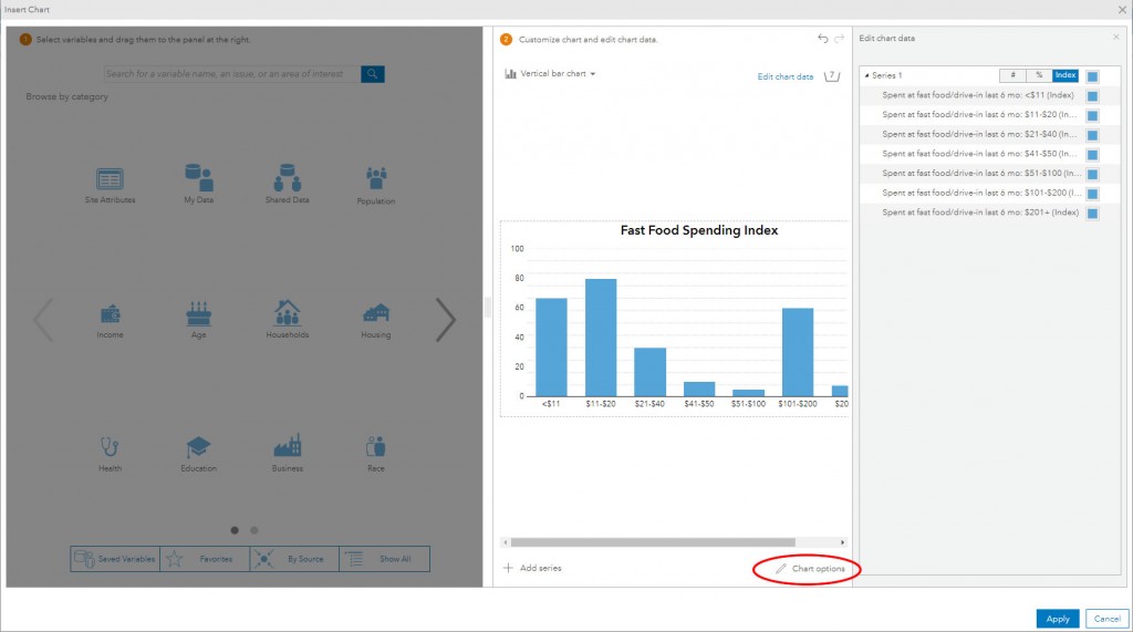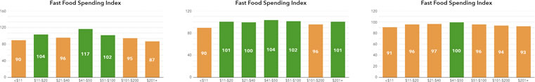 The chart is built using fast food spending data which is automatically grouped into 8 categories, ranging from under $11 to over $200. I want to color code each bar based on how the area compares to the national average, so I must use Index values for the spending variable rather than absolute number or percent.