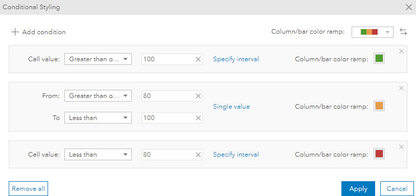 In this case, I created 3 sets of conditions, which symbolize each bar based on the following intervals; <80 red, 80-100 orange and >100 green.