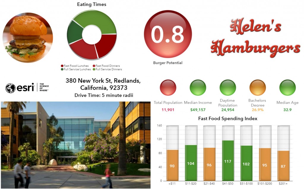 I frequently customize these charts to produce more compelling visual presentations by comparing the site I am analyzing to a predefined set of target conditions. For example, the site might require 15,000 people within a 5-minute drive or a median income over $40,000. In the screenshot below, I am using a traffic light system (green=go, orange=caution, red=stop) to show when the variables are above, between or below a set of predefined value ranges.