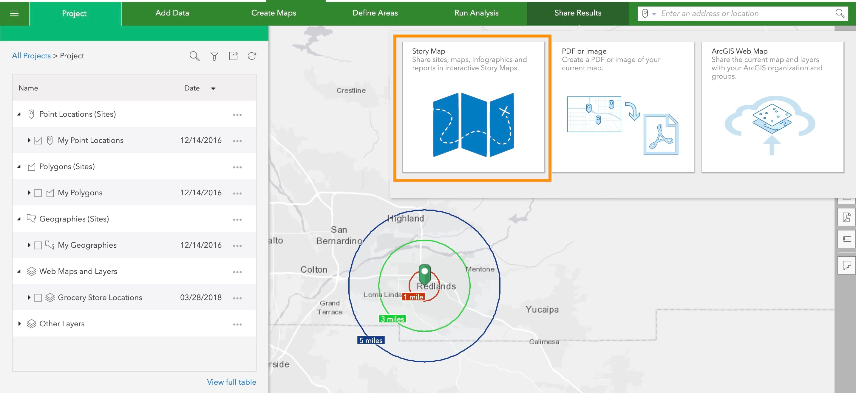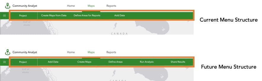 You will notice a new menu structure and renaming, along with two brand-new menus: Add Data, Create Maps, Define Areas, Run Analysis, Share Results. Common workflows are organized so you can navigate to them quicker. The new structure aligns the menu items in the order they are used in your work and organizes common workflows so you can navigate to them quicker. For example, you can add your own data for the project, create maps using your or Esri Demographic data, define analysis areas, run analysis, and share results with others.
