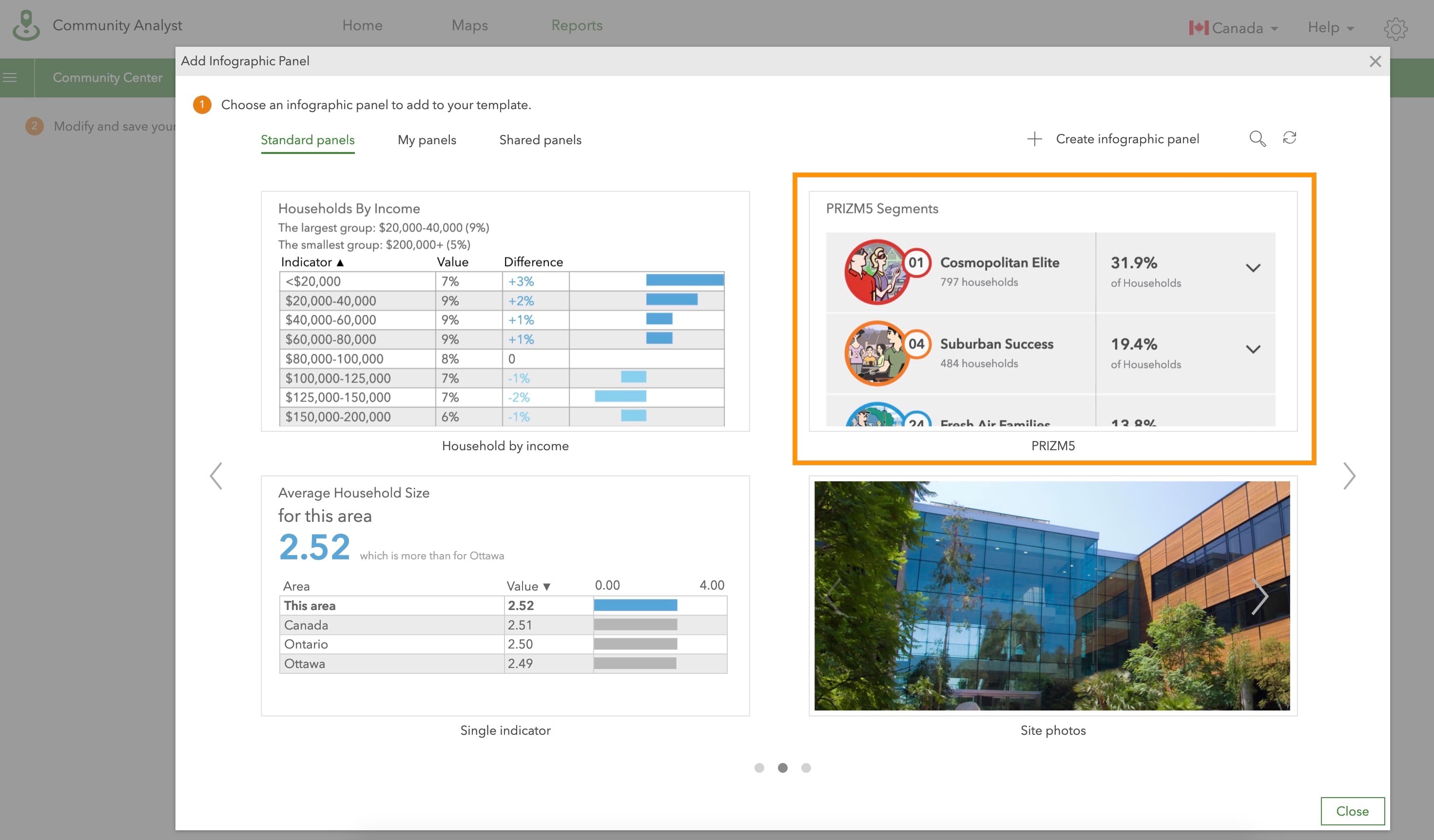 Determine top 3 consumer segments for any area in Canada using the PRIZM5 segmentation data. Simply add the PRIZM5 segments panel in your infographics and run it for any area.