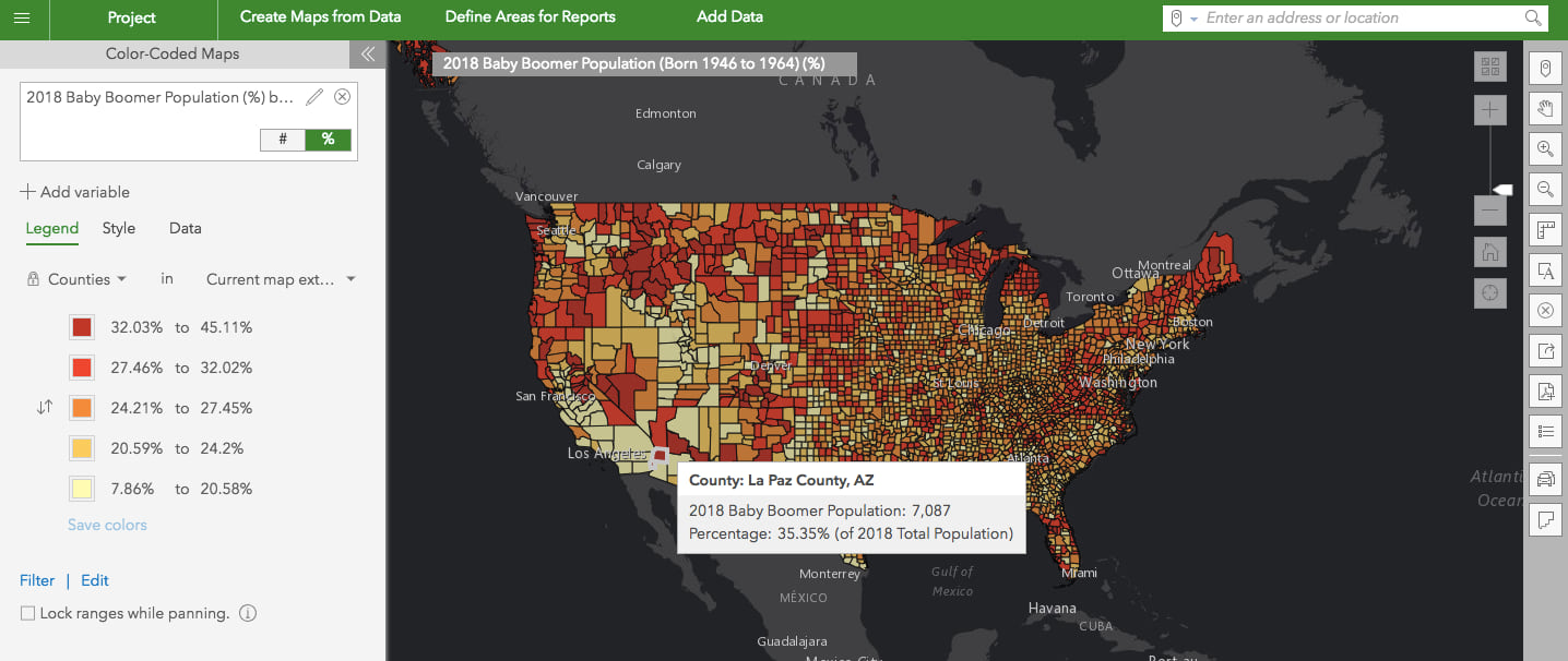The latest update of Community Analyst is here! This update includes 2018/2023 demographic data for the US, a new feature to summarize nearby locations, ability to filter layers using attributes, enhancements to comparison reports and infographics, and much more.