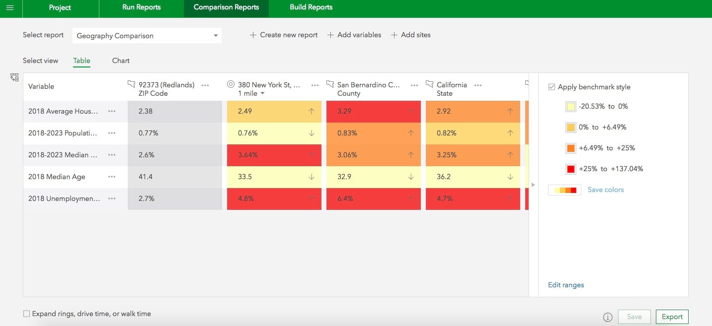 Use the new Geography Comparison template to quickly compare the key demographic facts for a location to the geographies where it is located. For example, compare population growth rate and average household size for a 1-mile ring around 380 New York St., Redlands to the geographies where the ring is located, i.e. zip code: 92373, county: San Bernardino and state: California.