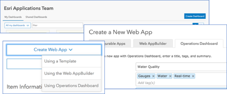 Dashboards are items within your organization. You can create them from your content view, when sharing a map, or by launching the Operations Dashboard by clicking the Apps button in the header of your ArcGIS site.