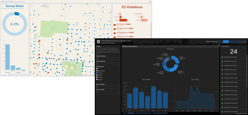Operations Dashboard offers a comprehensive and engaging view of your data, to provide key insights for at-a-glance decision making. It helps you monitor people, services, assets or events by bringing together multiple visualizations that work together on a single screen and are responsive to data that updates in real-time.