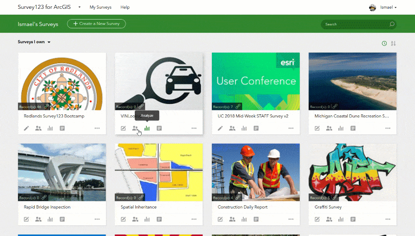 As the owner of a survey, this option gives you tighter control over what data can people see in your surveys. Here is a scenario where this new option will be handy: Pretend that you have published a survey for a group of Building Inspectors. Through Collaborate/Submitter you have already granted them access to your survey, so all Building Inspectors are happily submitting their work to you. Next, you would also like Building Inspectors to have access to their own submitted data through the Survey123 website. Through Collaborate/Viewer you will next grant the Inspectors Group with access to the results of the survey, but since you do not want inspectors to see someone else’s work, you will grant visibility to ‘Only their own submitted records‘. At that moment, inspectors can log into the Survey123 website and access their own records. For example, they can use the Data tab in the Survey123 website to export all their inspection data into Excel, generate high quality printable reports of their inspection records or even look at trends across their own inspections through the Analyze tab. Administrators of the ArcGIS organization and owners of the survey will always have access to all records.
