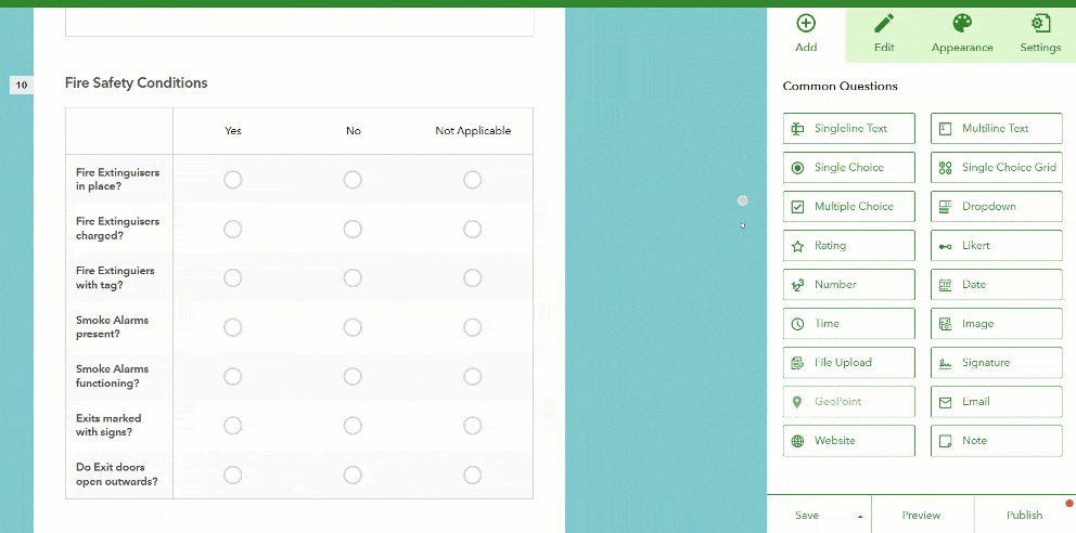 There are multiple scenarios where Single Choice Grids are useful. A classic one is checklists, like the one presented below for a Fire Safety inspection.
