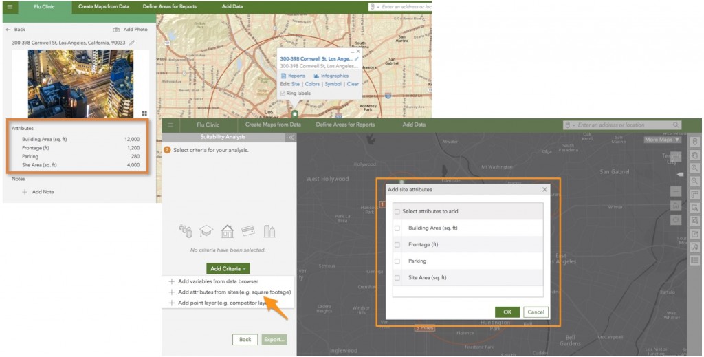 Create more informative infographics by using location attributes such as number of parking spaces, rent, and more. Add site pictures and present market information with more attractive infographics. Include your own business data more easily and combine them with Esri Demographics content. Move, rotate, and re-size elements within the infographic panels more efficiently.