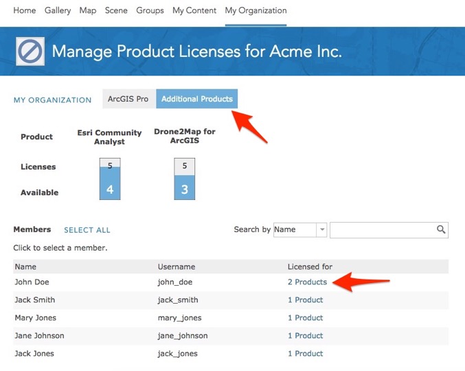 3. Click the Additional Products tab. Here you can see the premium apps your organization has been provisioned for and, for each of those premium apps, the total number of licenses and number of licenses available for you to assign to members. If you are a Community Analyst customer, you should see Esri Community Analyst.