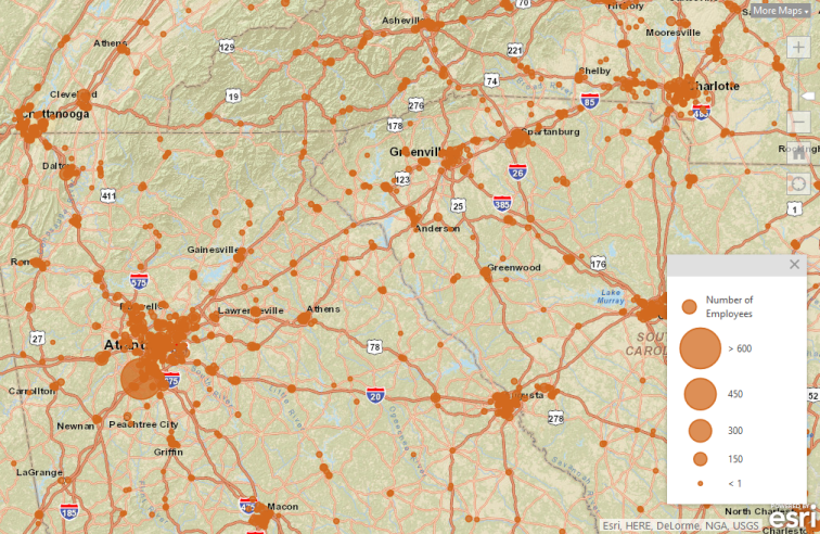 - Display points (business searches or your own imported data) and use associated attributes to distinguish differences. There are four new ways to display point data: by type (non-numeric attributes), by color (numeric attributes), by size (numeric attributes), and by heat map. For example, use the number of employees associated with a business to change the size of each location’s pin on the map.