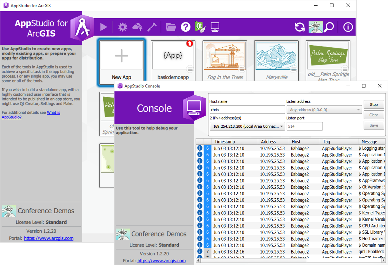 AppStudio now includes support for logging software messages using the syslog standard protocol. This allows developers to see and log under-the-hood information to help debug their apps. AppStudio Desktop has a new AppConsole tool; this is a syslog console built in to AppStudio, capable of receiving data from any device on the same network. And for convenience when testing apps or when working with enterprise apps, AppStudio Player has built-in compatibility with AppConsole.
