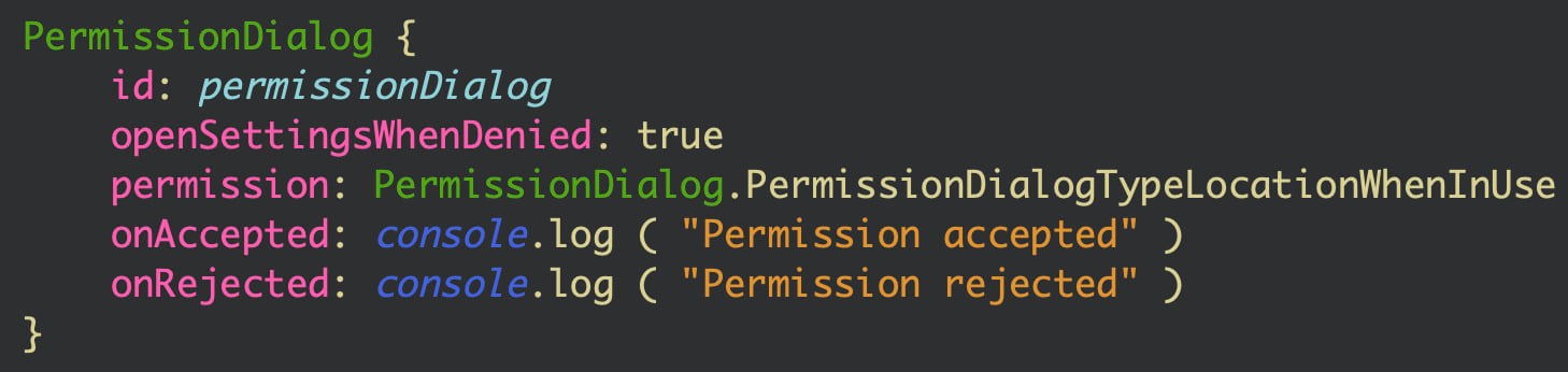 The snippet below demonstrates how to request permission for the device’s location. By setting the property openSettingsWhenDenied to true, the app opens application settings when permission is denied.