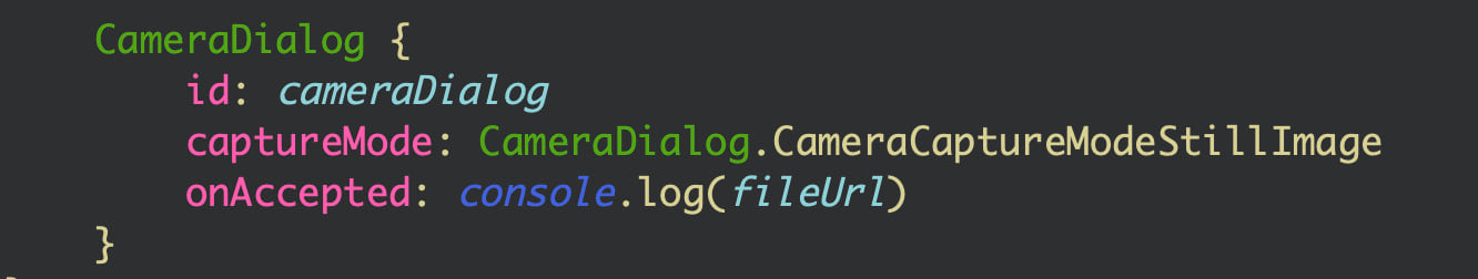 The CameraDialog is a separate component and it works in addition to the QML Camera component. The new Camera Dialog provided in ArcGIS.AppFramework.Multimedia gives you a solution to easily add photo and video capture to your custom app.
