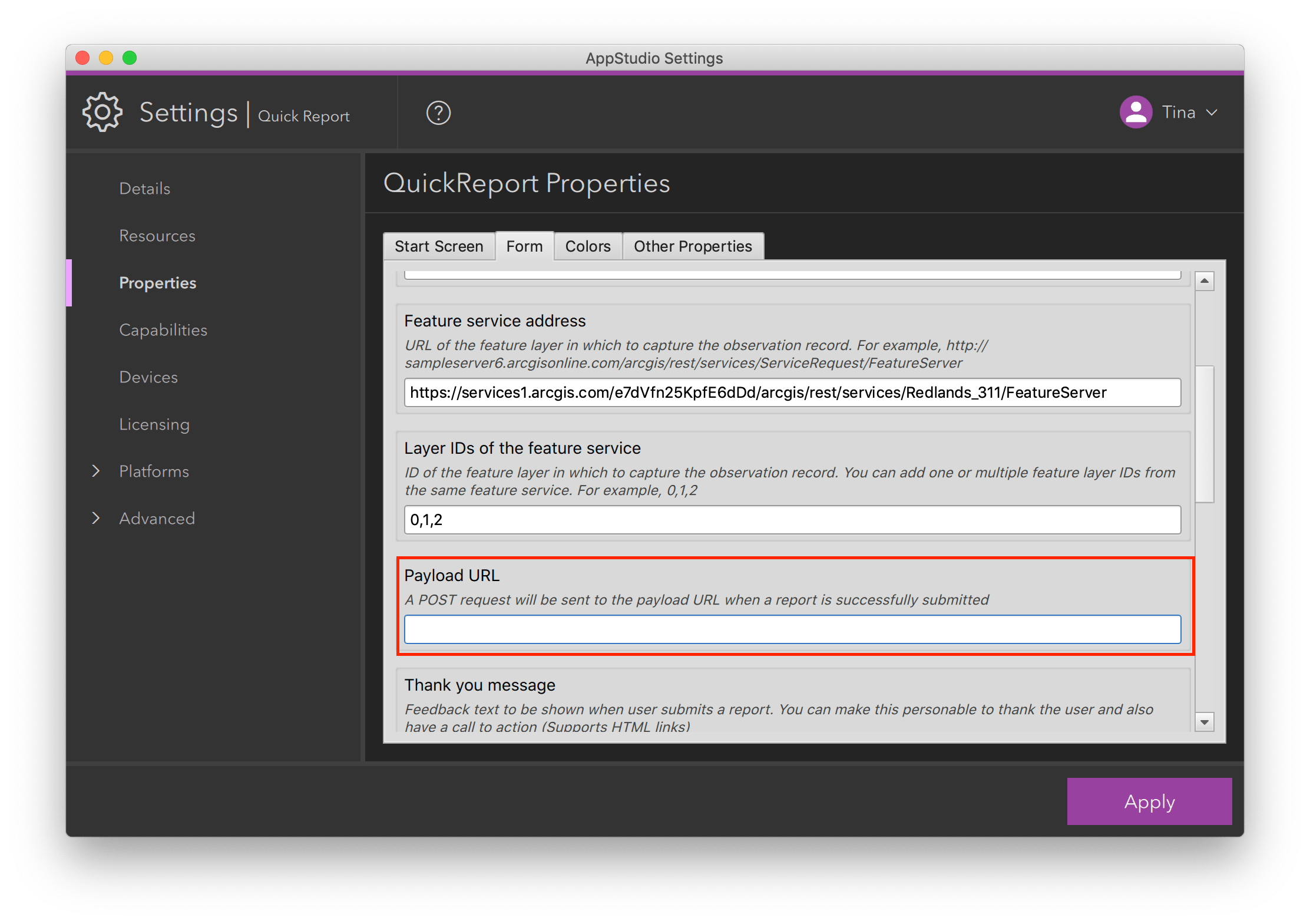 Starting from this release, you will be able to incorporate webhooks to invoke further actions such as automated email or an SMS text response when a report is successfully submitted. This can be easily configured by providing a payload URL in the AppStudio Settings tool.