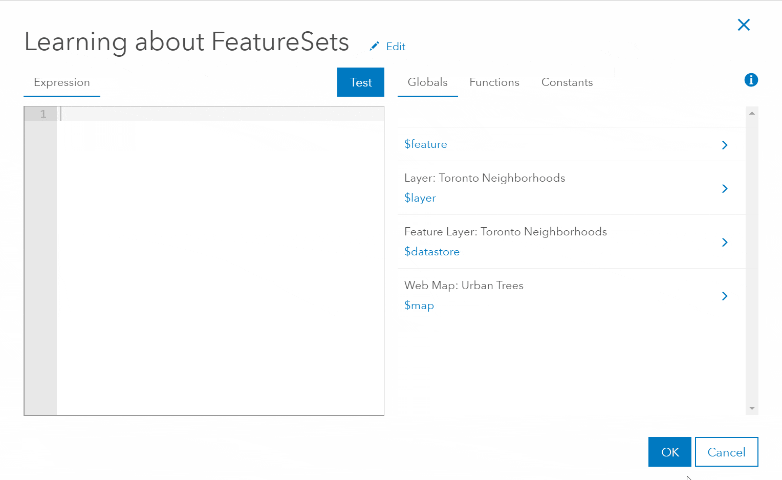 FeatureSets, as the name suggests, are a set of features. How many features will depend on your data and the functions used in the expression. In the simplest case, if you define a FeatureSet from a feature layer, it is all the features in the feature layer. The second aspect of FeatureSets is how you reference or access them. When defining a FeatureSet from a feature layer, you need to tell the Arcade expression where to look. That is done with global variables: