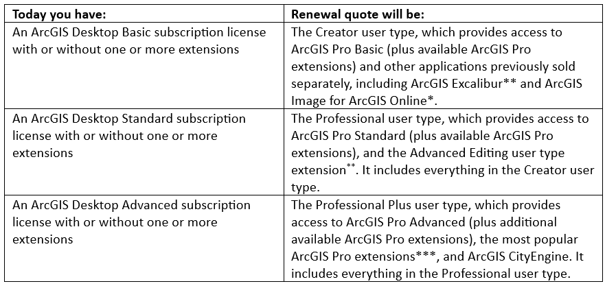 If you opted in to automatic renewal upon purchasing your ArcGIS Desktop annual subscription via the Esri Store, note that the subscription will not automatically renew for a user type. Instead, you will receive a renewal quote for the equivalent user type license(s). Thereafter, you will need to accept the new quote using the provided instructions for continued access to our currently supported desktop GIS software, ArcGIS Pro.