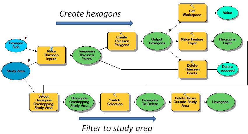 This tool creates a mesh of hexagons overlapping a study area. I only had to create one script tool for the model, relying heavily on standard ArcGIS tools in the model to keep code (and future maintenance!) to a minimum.