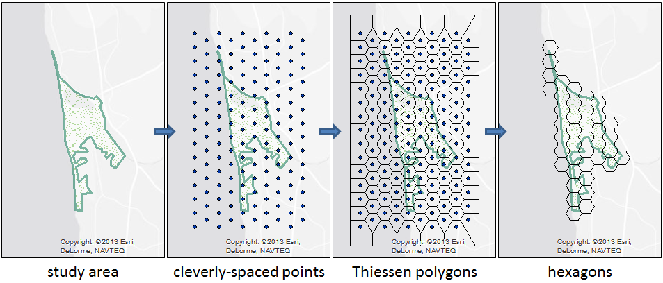 If you don’t like the result, you can choose a different hexagon size and run the tool again, or you can use ArcMap’s editor to fine tune the hexagon locations. You can also dig into the relatively small bit of script code or change tools within the model to get the result you’re looking for.
