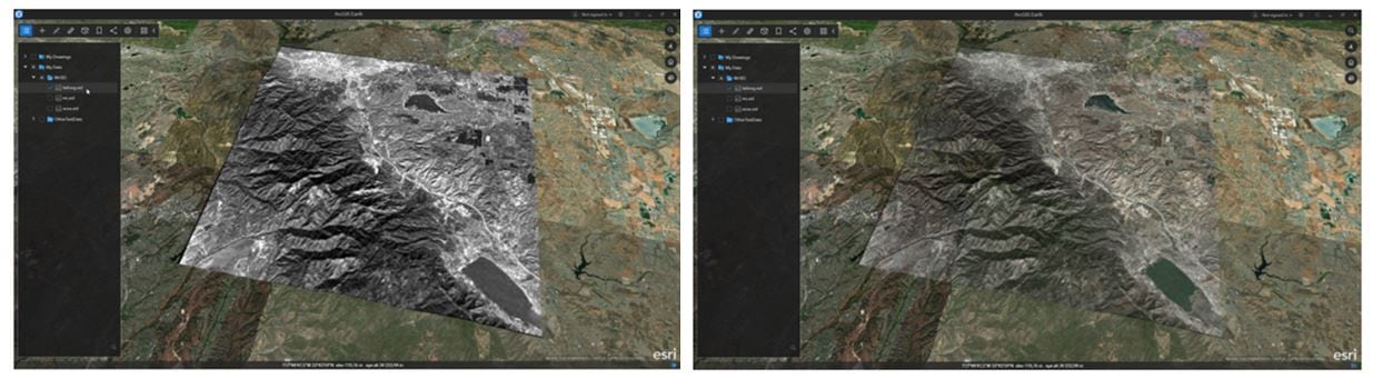 ArcGIS Earth continues to add new data types for users to access, and in this latest release, ArcGIS Earth will also consume the popular MrSID file format developed by LizardTech for raster file types, such as orthophotos. The ability to adjust the appearance is integrated into the MrSID format.