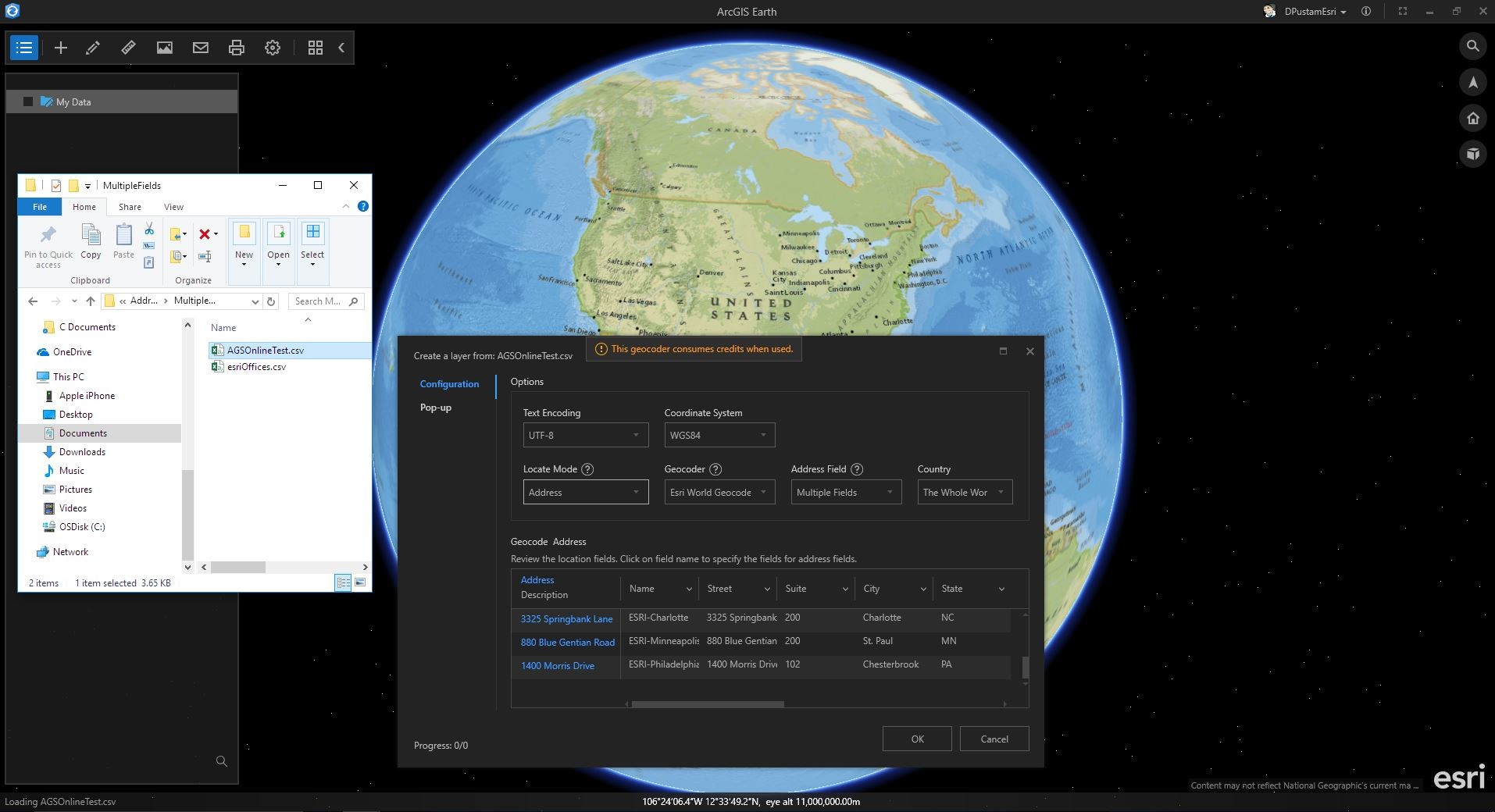 In ArcGIS Earth 1.6 you can use portal geocoder and world geocoder from ArcGIS Online during CSV/TXT geocoding. When searching in ArcGIS Earth, users can always use any geocoder from the portal. Also with ArcGIS Earth 1.6 are UIUX improvements for CSV and TXT files. Importing CSV/TXT includes the ability to select multiple fields or a single field for batch geocoding, as well as the ability to rematch failed geocoding address items.