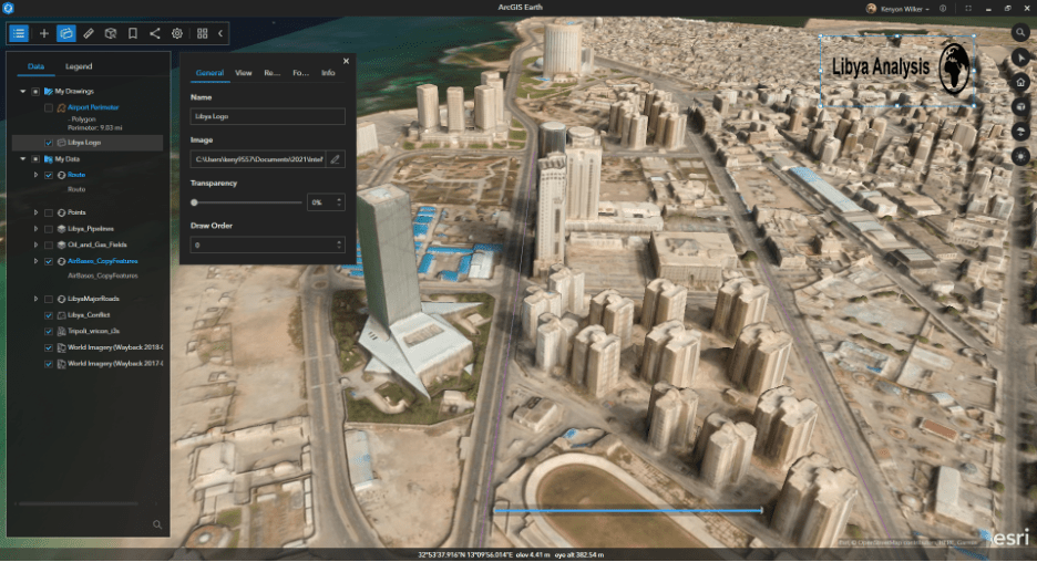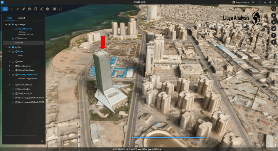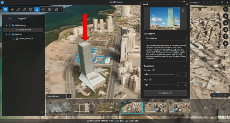 Add another screen overlay, but this time select the arrow.png image in your folder. Place it above this building in downtown Tripoli that is the Marriott.