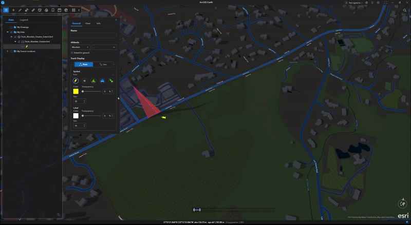 - Capture and Symbolize Dynamic Entity Observations and Track Lines: ArcGIS Earth supports various layer properties, including visibility, symbology, elevation mode, and labels. Users can display past observations and tracks of moving features like vehicles using distinct symbology to differentiate current observations from previous ones. This functionality allows users to effectively capture and symbolize dynamic entity observations, providing a clear and comprehensive view of real-time data. By visualizing the movement and changes of entities over time, users can make informed decisions and respond efficiently to dynamic situations.
